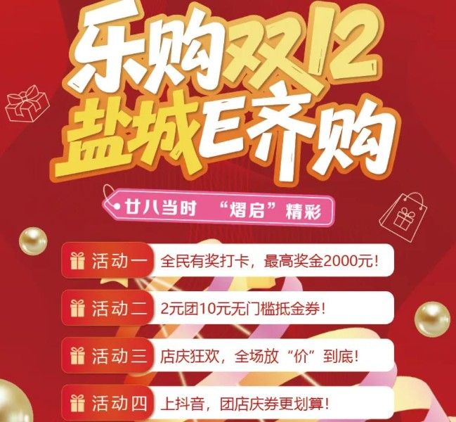 12月1日至31日,美团“乐购双12 盐城E齐购”活动持续在线!打开美团App搜索“盐城乐购双12”或扫描海报二维码,就能一键领取88元专属乐购券包。不管是想打卡必吃榜美食、点份放心外卖,还是计划周边游买景点门票、订舒适酒店,都能享受优惠,还有必玩榜、必住榜专属指南,帮你解锁盐城消费新风尚~